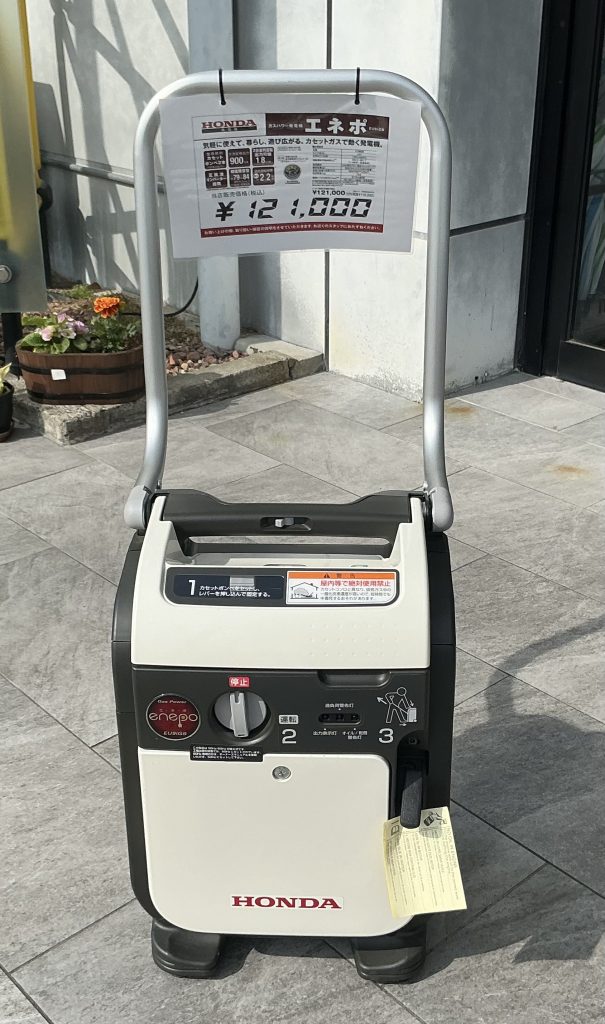 万が一の災害対策に、趣味のキャンプや釣りに、カセットボンベで動かせるホンダのエネポ、ショールームにて展示中です!